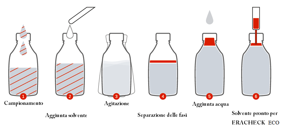 La preparazione del campione avviene aggiungendo direttamente nella bottiglia di campionamento un solvente ciclico alifatico (cicloesano o ciclopentano). Non c’è bisogno di utilizzare un imbuto separatore!